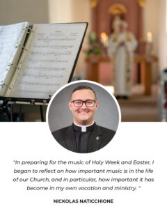 Alleluia! How great it is to once again proclaim as the family of God that Jesus is risen from the tomb during this Easter season! Our celebration of Easter is in many ways the summit of our liturgical year as Catholics, which means that we celebrate some of the most beautiful liturgies of the year. A large aspect of these beautiful liturgies is music, especially as we once again sing alleluia and rejoice in the resurrection of our Lord. In preparing for the music of Holy Week and Easter, I began to reflect on how important music is in the life of our Church, and in particular, how important it has become in my own vocation and ministry.