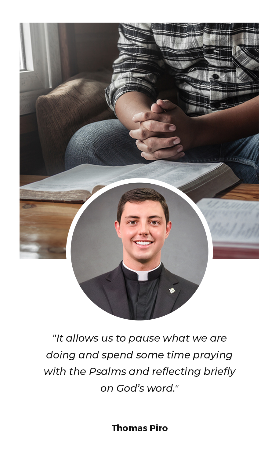 The Liturgy of the Hours is a response to the apostle Paul’s message to the Thessalonians, “pray without ceasing” (1 Thess 5:17). Obviously, Paul does not mean we must be on our knees all day in prayer, but rather, we should sanctify the day with a routine of prayer. The Liturgy of the Hours does just that! It allows us to pause what we are doing and spend some time praying with the psalms and reflecting briefly on God’s word. It may be a bit intimidating at first, but once you make it a habit, you begin to develop a deep love for the Psalms and Scripture. Maybe begin with just Morning Prayer or Evening Prayer, and if the Spirit moves you, add another hour to your daily routine. I encourage you to consider joining the Church in praying the Liturgy of the Hours and respond to St. Paul’s command to pray without ceasing.