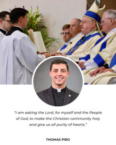 A few weeks ago, Bishop Sullivan instituted my classmate, Tim Mulranen, and me to the ministry of acolyte. Many people from my home parish asked me what exactly an acolyte is. An acolyte assists the priest and deacon at the altar during the preparation of the gifts, purifies the chalice and ciborium, and serves as an extraordinary minister of Holy Communion. This ministry is to prepare Tim and me for ordination to Holy Orders in the coming years.