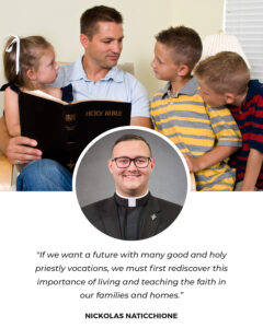 Every single Catholic is called to heaven, to the beatific vision of seeing God face to face and experiencing the fulness of happiness, and in turn we are all called to live that vocation in our daily lives. I propose that the first step in solving the crisis of priestly vocations is to first build a true “culture of vocations,” in which all Catholics faithfully live their call to holiness. This encompasses the next level of my proposed solution to the crisis, which is rediscovering the importance of the domestic Church, meaning the faith lived in families at home. Throughout the Church’s history in so many of her documents, we are taught that the instruction of the youth in the faith is primarily the obligation and right of parents. If we want a future with many good and holy priestly vocations, we must first rediscover this importance of living and teaching the faith in our families and homes. In order to build up the domestic church, we must also rediscover the married life as a particular vocation in and of itself.